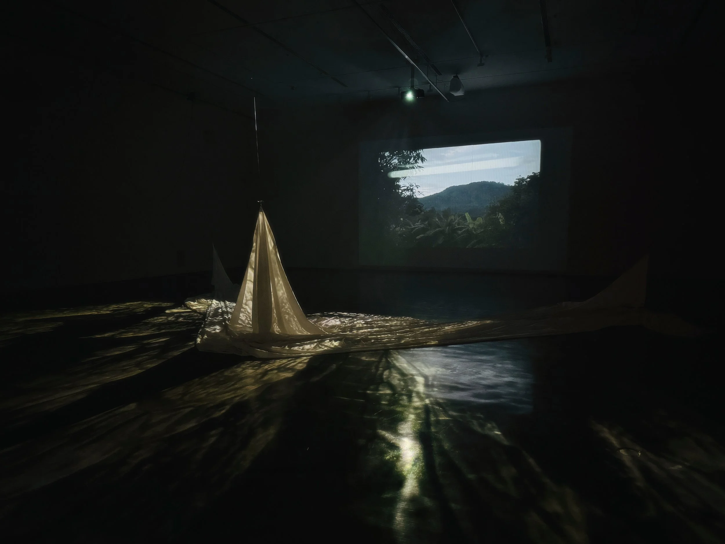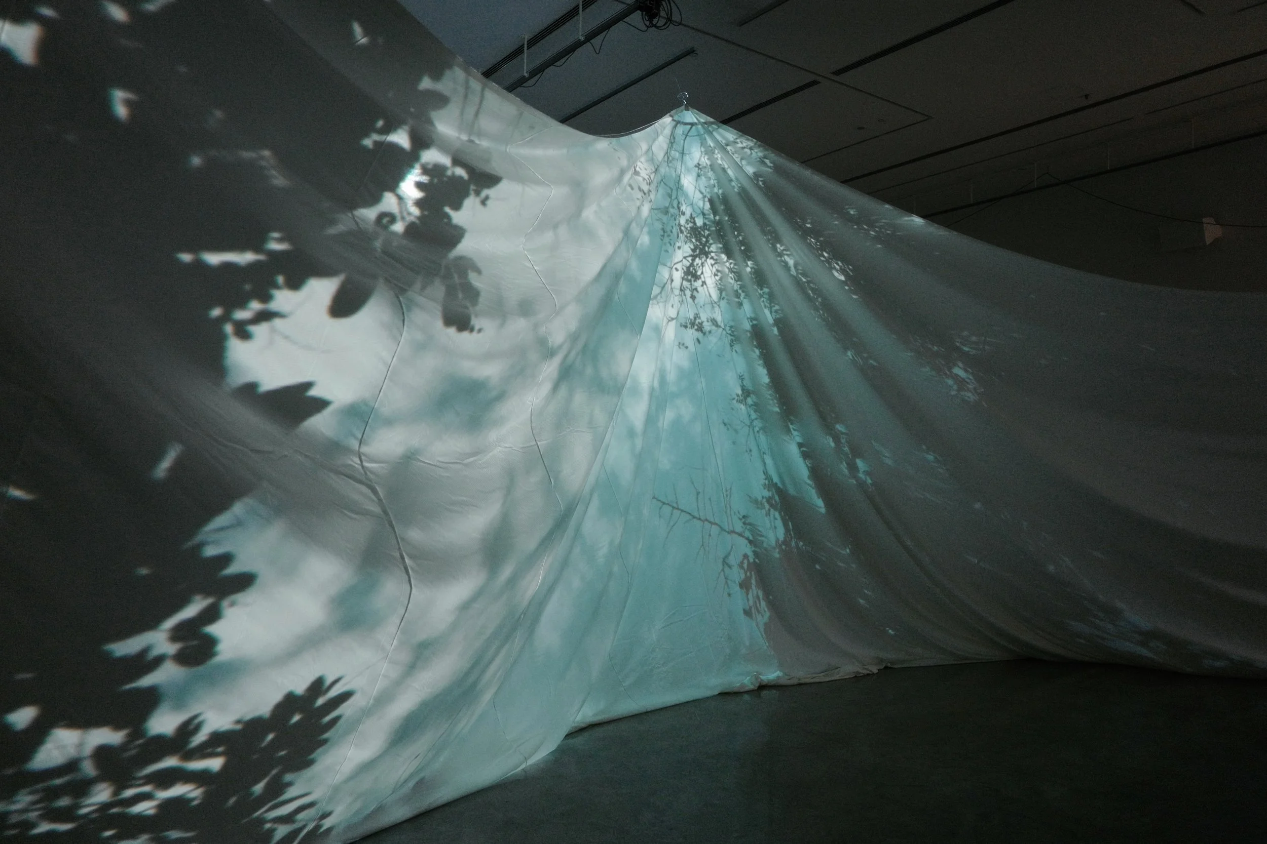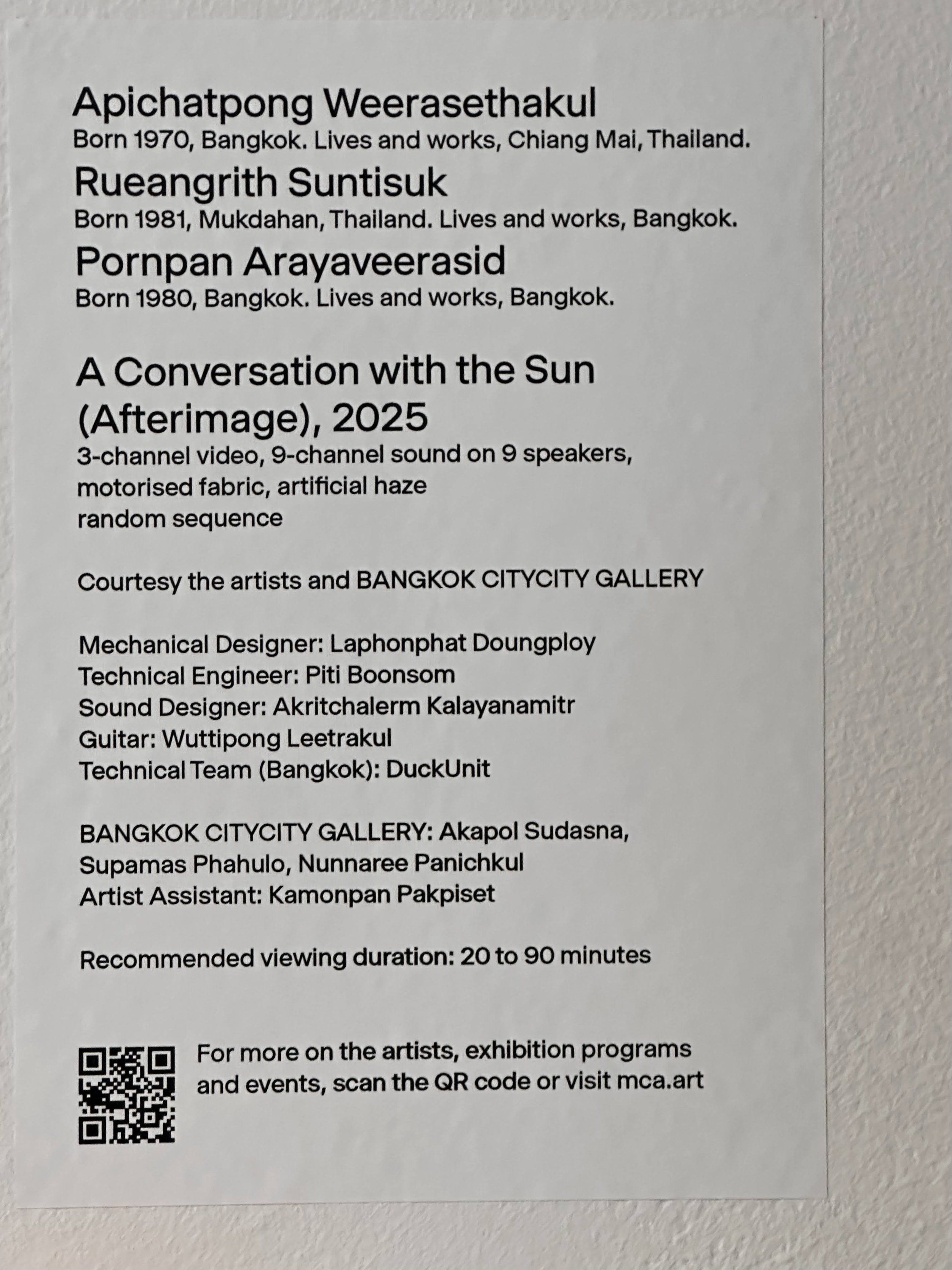 A Conversation with the Sun (Afterimage) is a new video installation created for the MCA by Apichatpong Weerasethakul (b. 1970, Bangkok). Made in collaboration with Rueangrith Suntisuk and Pornpan Arayaveerasid of Bangkok-based collective DuckUnit, the work considers light and its transitory nature. It features fragments from video diaries taken by the artists which are projected onto a slow-moving length of fabric, acting as both curtain and screen. Images appear, dissolve and reappear, creating a dream-like space where, as Weerasethakul comments, 'surfaces shift and meanings transform'.