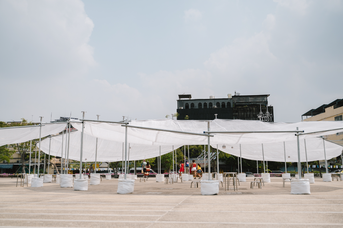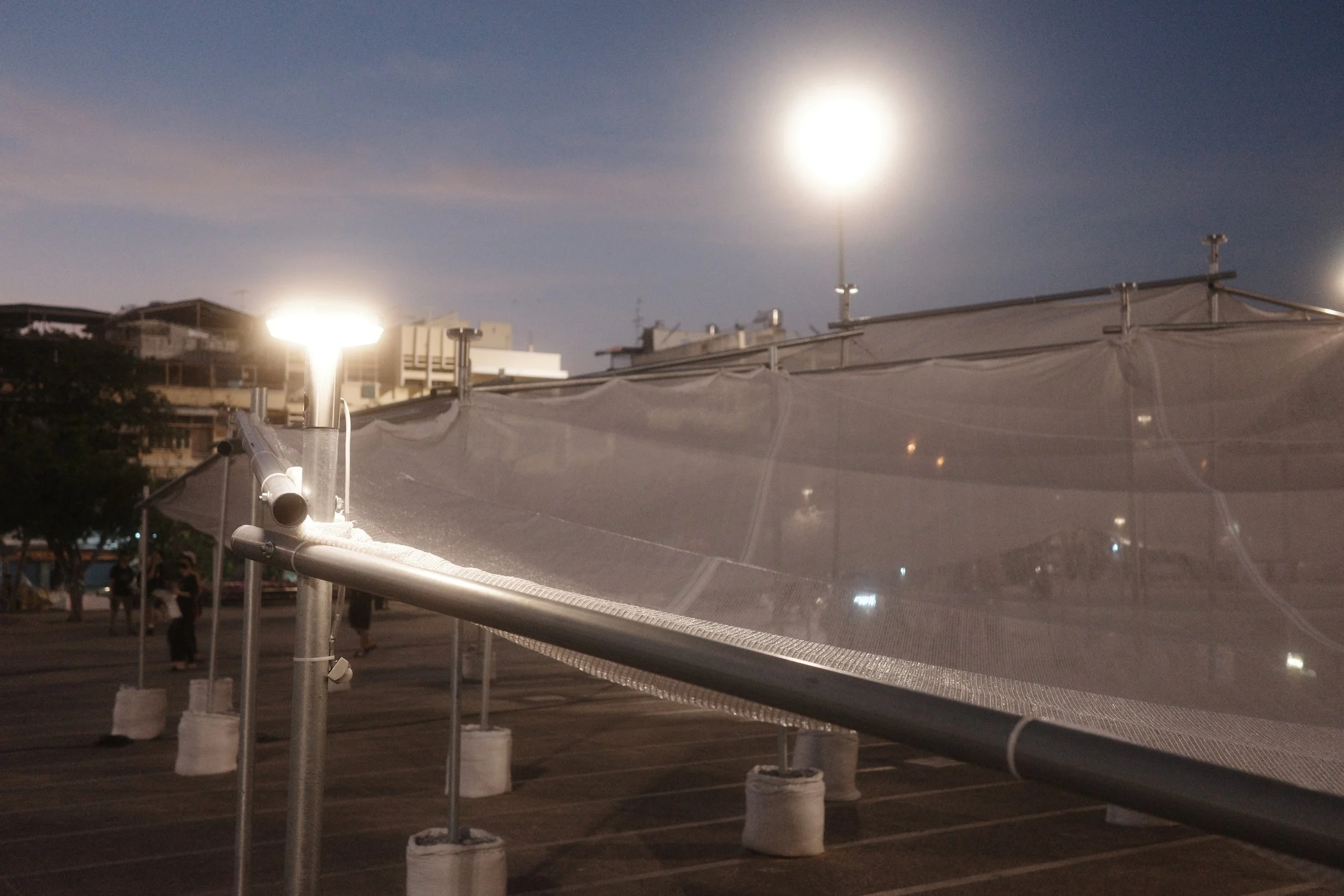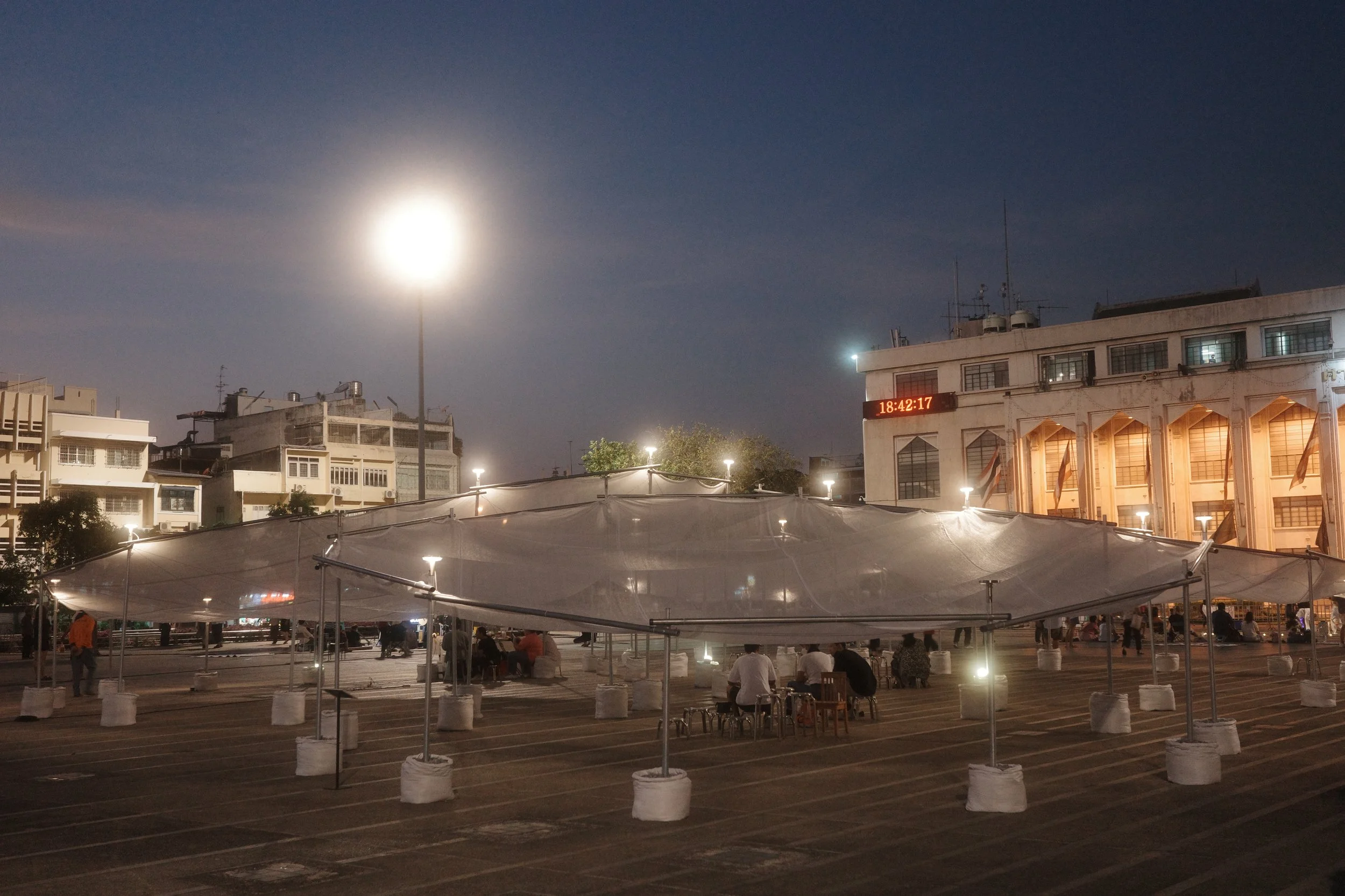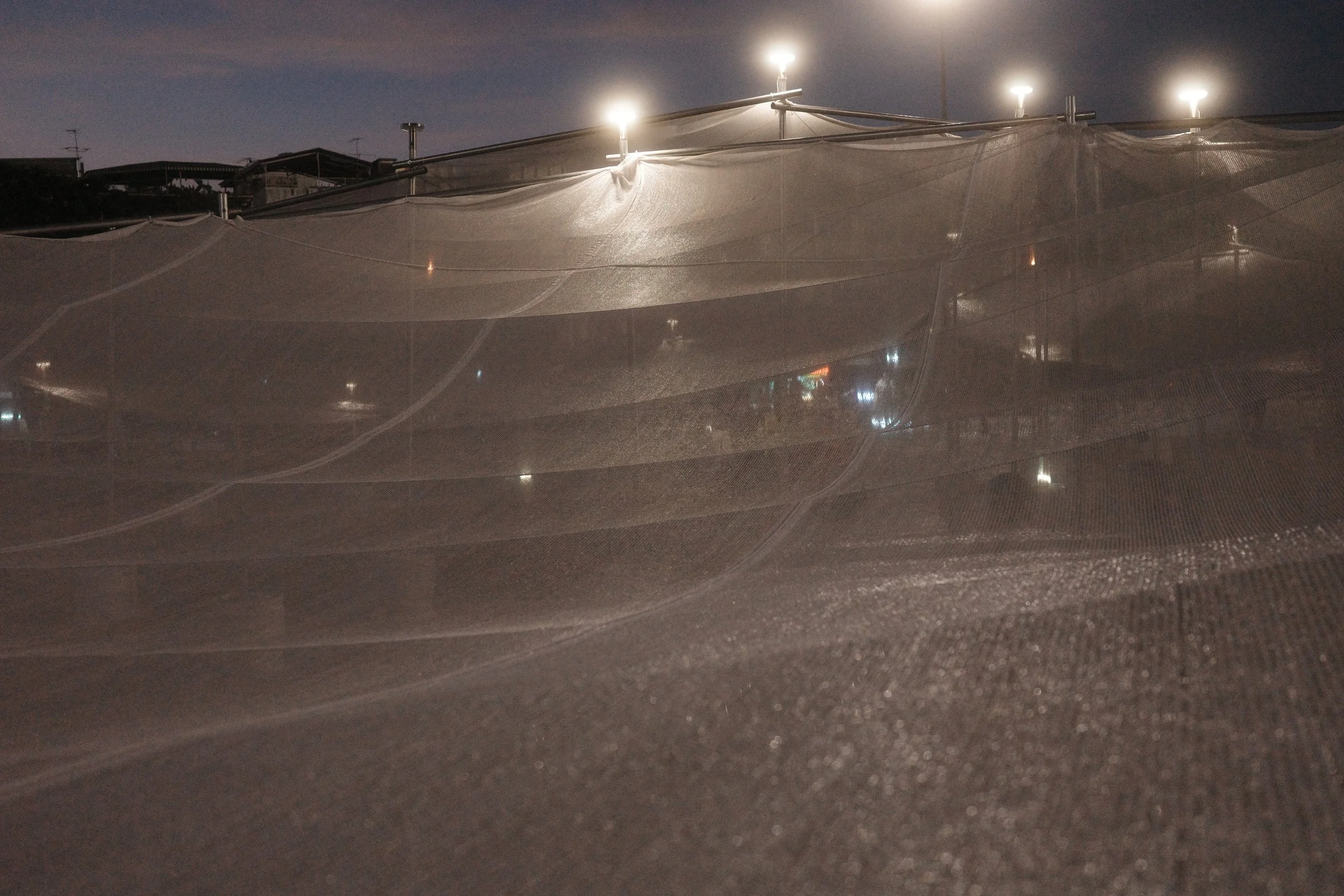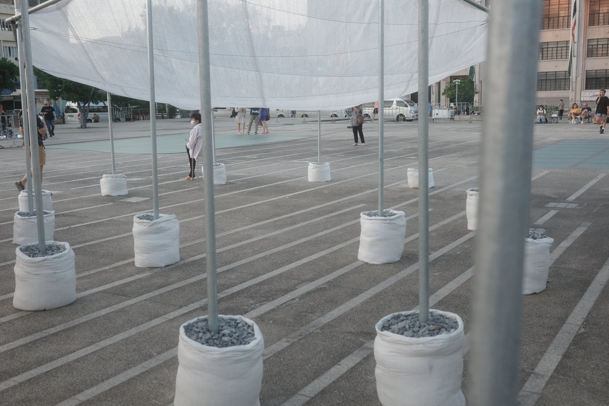 The cluster of circular lightweight formations are arranged in a clover-like form creating one large enclosure. Underneath the sloping roofs are shaded and permeable spaces welcoming light, air, movement and people. Diverse spatial conditions and connections are created by the irregular form and differing heights. After the event, each of the units can be relocated or re-configured for various uses. By giving form to things taken from the everyday, "Clover" is a playful exploration into self-generating architecture.