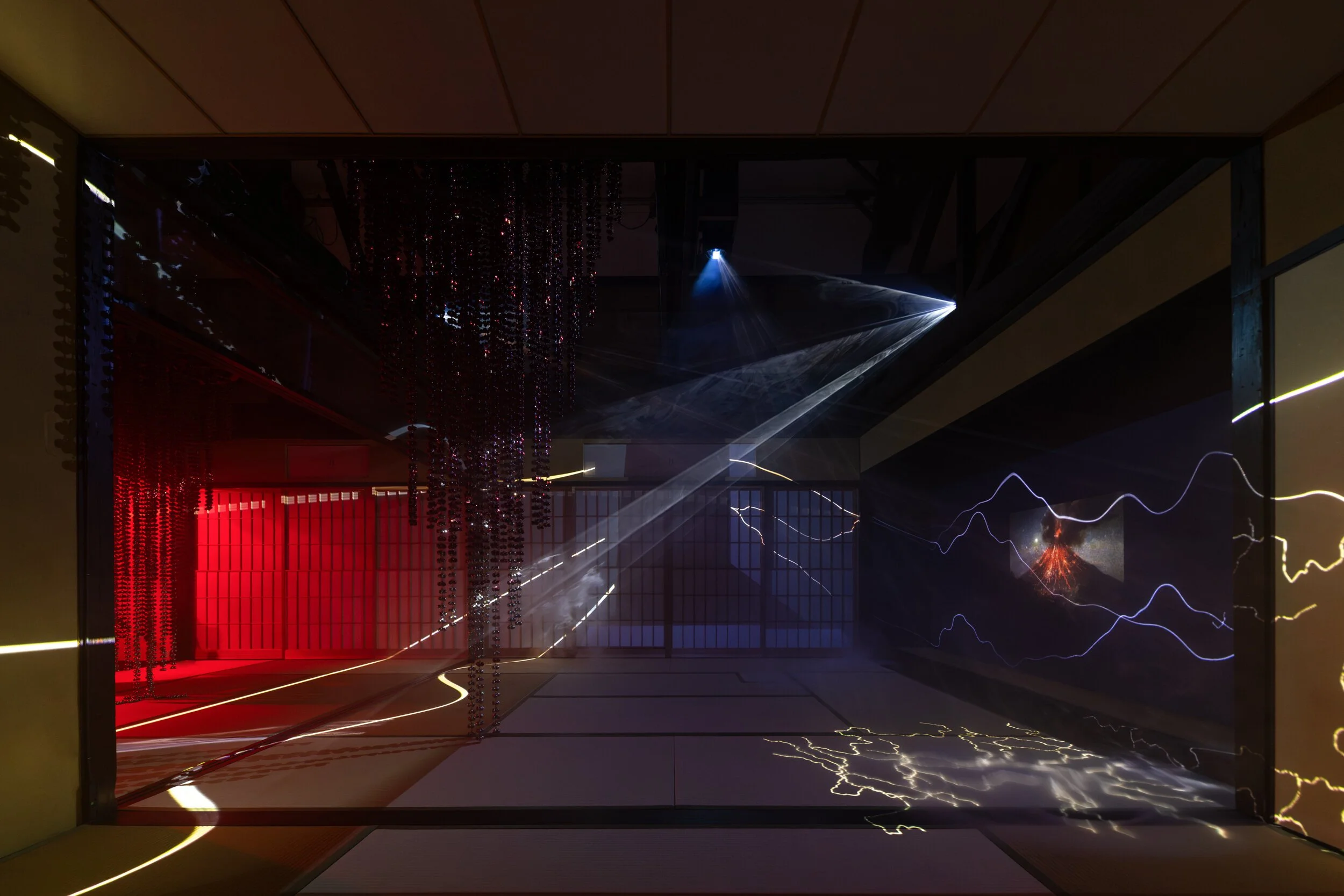 Under the project title of "Ring of Fire," the entire house is profoundly rendered by works of two artists, who worked collaboratively to conceptualize the time and place. In this house, the cycle of "Day" and "Night" is articulated by the alternating activation of works